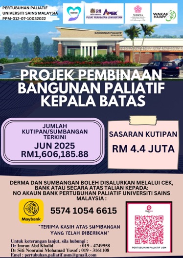 Pada tahun 2022, kami telah menubuhkan satu non-governmental organization (NGO) di bawah USM iaitu Pertubuhan Paliatif USM yang berdaftar di bawah Jabatan Pendaftaran Pertubuhan Malaysia (ROS). Pertubuhan ini bertujuan untuk mencari dana bagi projek pembinaan Bangunan Paliatif Kepala Batas yang bertujuan memberikan rawatan pesakit dalam (in-patient care) yang lebih mesra kepada pesakit paliatif dan ahli keluarga agar mendapatkan rawatan yang terbaik. Usaha-usaha pengumpulan dana ini masih aktif dijalankan sehingga kini.